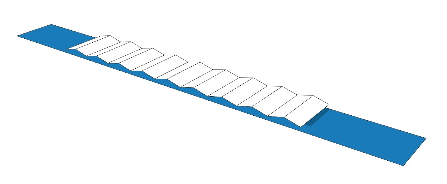 Using Rhino and Ladybug Tools, we built a simplified digital model of a canal segment with a Solar Waves array mounted just above the water surface. The geometry was based on real-world design specifications — a surface area of 454 m² and an accordion-style structure that spans the canal laterally.